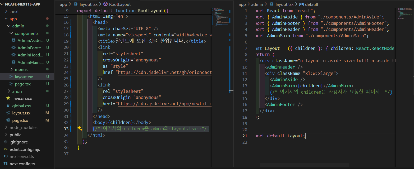 layout.tsx가 2개인 상황 : 부모(app) 레이아웃의 {children} 안에 자식 레이아웃이나 페이지가 들어가는 구조 이미지에는 부모는 RootLLayout에 자식은 admin에 있는 해당하고 admin이 부모면 안에 있는 layout에서 {children}은 사용자가 요청한 페이지