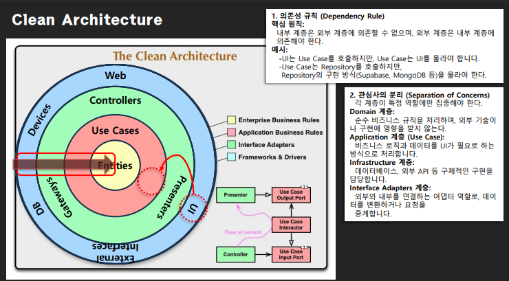 Clean Architecture : 로버트 C. 마틴 아키텍처로, 의존성 규칙에 따라 안쪽(비즈니스 규칙)과 바깥쪽(외부 인터페이스)을 엄격히 분리, 유지보수성과 테스트 용이성이 극대화된 설계 방식